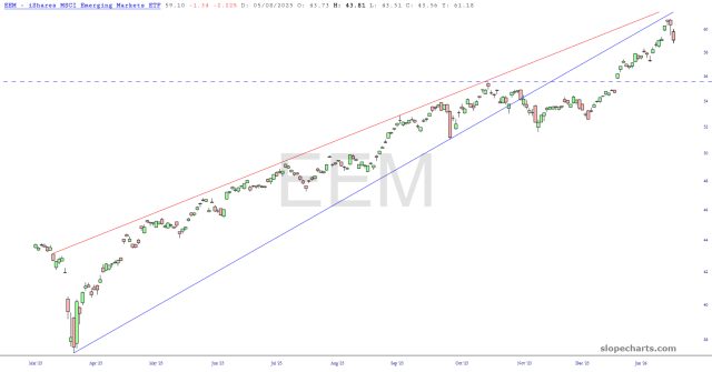 This was an enormously important week in the markets. Let’s look at a dozen crucial ETF charts. First off is the emerging markets, which is sporting a fantastic wedge pattern. It broken this pattern months ago and executed a pitch-perfect “tag” of the underbelly of the wedge pattern just a couple of days ago. The fall on Friday makes all the sense in the world.