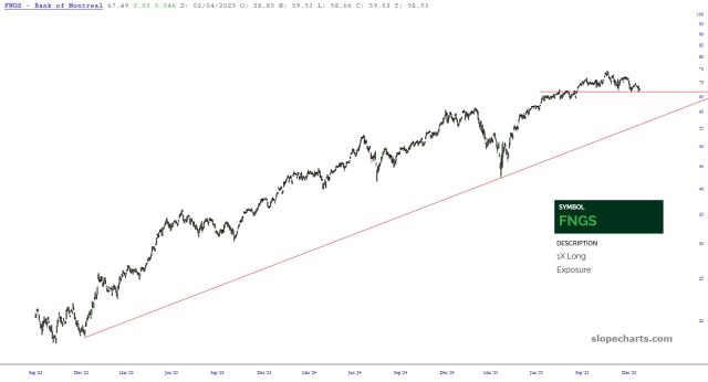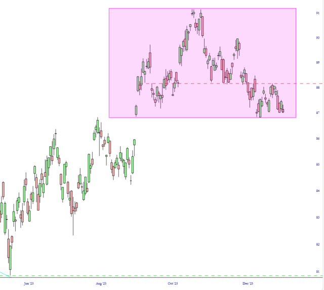 The U.S. bond market, represented below by the TLT fund, continues to break down. It is getting close to support, and this Friday morning’s jobs report will probably be the catalyst to either start the plunge or deny the pattern’s completion.