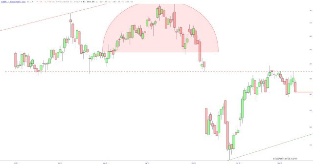 I have tiptoed back into buying puts (as opposed to just shorting stocks), and one of the tiny number I’ve selected as my victim is DoorDash (DASH), against which I own June $270 puts. They are up 12% so far, and I’ve got great hopes for bigger gains. Below is the stock, shown with an increasingly long time horizon.