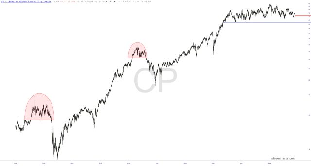 Since the SCOTUS ruling didn’t happen, it’s a pretty dull day (and annoyingly green, I must say). Here are a trio of charts I found for you which have one thing in common: distribution tops that have been grinding away for years and may well represent major peaks that last for a very long time as they work their way lower. For your consideration……..