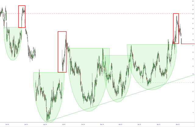 There are a variety of ETF products which are constructed from the elements of the FAANG tech stocks. One look at these should send shivers down bullish spines, as they are marvelous topping patterns (and account for a HUGE proportion of market value).