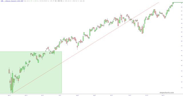 My quote screen is awash in green at the moment, which has taken care of all the warm feelings I was having yesterday about the market. Small caps, as illustrated here with IWM, are especially strong, blasting to new lifetime highs. There hasn’t been any meaningful selling in months at this point.
