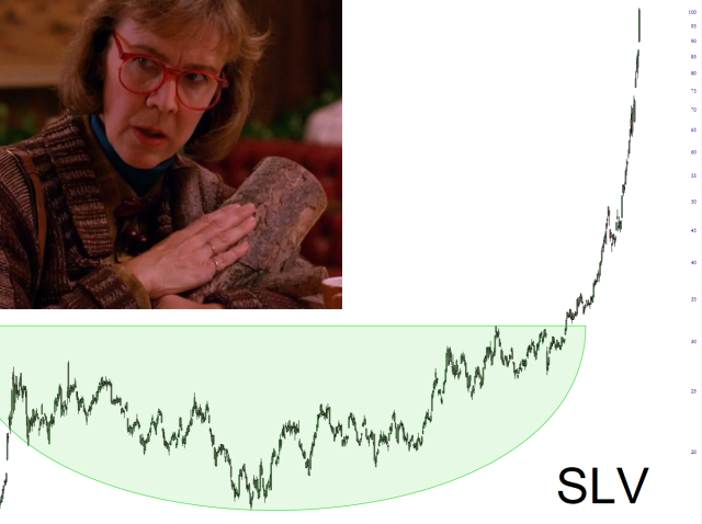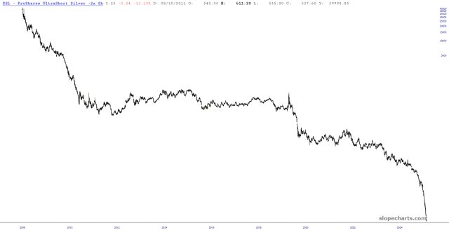 Sometimes when I want a flair for the dramatic, I will sneak into the preferences for SlopeCharts and change the scale to arithmetic instead of the more appropriate logarithmic. In the case of precious metals, however, I don’t even have to bother. These are log scale charts, in spite of the fact they look absurdly explosive.