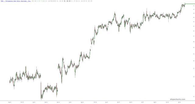 Surely most of you are acquainted with the epithet TDS, which our terribly clever President uses on occasion in an attempt to marginalize normal people. I was curious if there was a stock with that symbol, and – – may I introduce to you Telephone and Data Systems, which is at lifetime highs. How fitting! I wish it well.