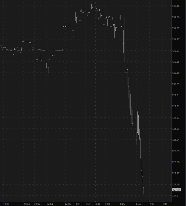 I saw many reports about how good this was for the Exxons and Chevrons of the world. Well, yes, pre-market quotes were strong, but those are likewise stumbling (which is particularly strange considering that strong oil typically helps these firms). Here is XOP: