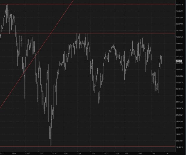 Over a longer time horizontal, the /NQ has been quite stuck under resistance (horizontal line). This is the kind of market that can grind an aggressive trader into hamburger. For a swing trader like myself, the market sucks out loud, because once you’re firmly positioned, the market blows the other way and lays waste to much of the profits garnered.