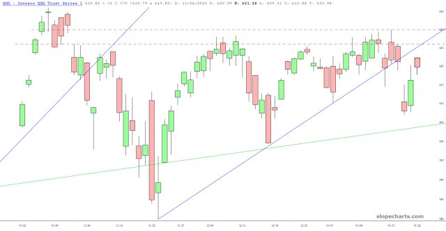 The point I’m trying to make is that if things are perfectly poised for a drop, as with the QQQ below, and the market goes up anyway, well – – that sucks out loud as well. But let’s hold off on the handwringing until we get to Friday’s close, shall we?
