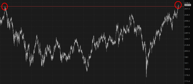 The small caps continue to be a source of strength. Again, as I’m typing these words, it is the only equity future still (barely) in the green. What’s mildly interesting is the relationship of that red line (the prior peak in 2021) to present price action.