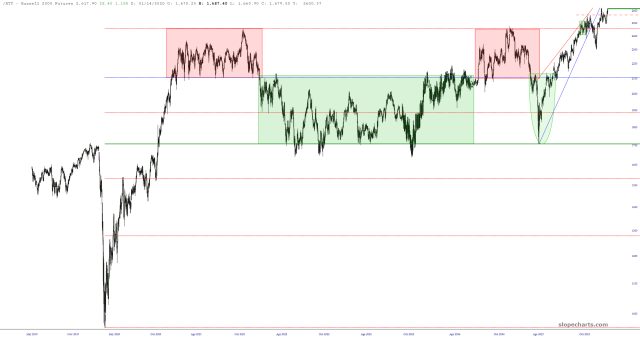 The never-going-down market keeps on keeping on. The small caps are the leaders today, up more than 1% and at lifetime highs. Here is the Russell 2000 cash index: