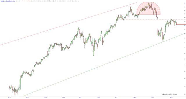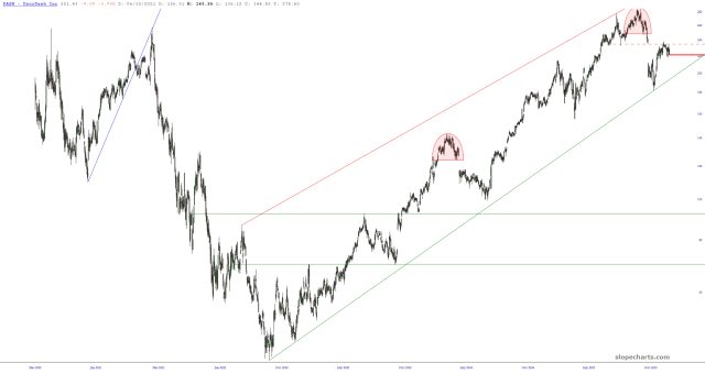 I have tiptoed back into buying puts (as opposed to just shorting stocks), and one of the tiny number I’ve selected as my victim is DoorDash (DASH), against which I own June $270 puts. They are up 12% so far, and I’ve got great hopes for bigger gains. Below is the stock, shown with an increasingly long time horizon.