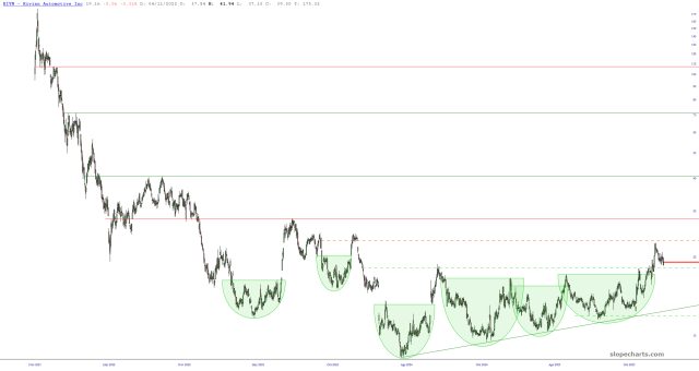 I look at thousands of charts per week, and in this insane market, the only non-precious metals related item that appeals to me on the long side is Rivian (RIVN), the electric truck maker. I had decent success with RIVN last year and I re-entered it this morning at $18.90 with a stop at $18.25.