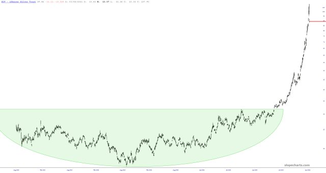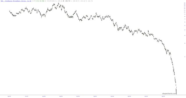The symbol ZSL is a double-inverse fund based on silver. It’s fascinating to see how the volume on this went absolutely ape this week.