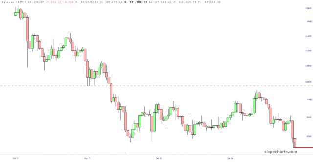 Over a somewhat longer timespan, $BTC has lost over one-third of its peak value. My view is that people are realizing how utterly useless this “innovation” is. I daresay crypto will be one of the biggest financial wipeouts in human history, in spite of the scumbags and grifters, from David Sacks all the way down, who have been pushing this scam for years.
