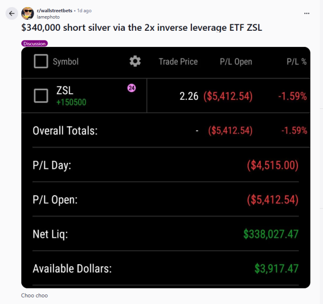 The double-inverse ETF mentioned above apparently caught the guy of a chap on WSB, who decided on Friday to pour the entirety of his portfolio into it. I suspect that at this very moment as I am typing these words, he is banging his head against his keyboard or praying for some kind of crazy overnight reversal. Here is what his position looked like shortly after he entered it on Friday:
