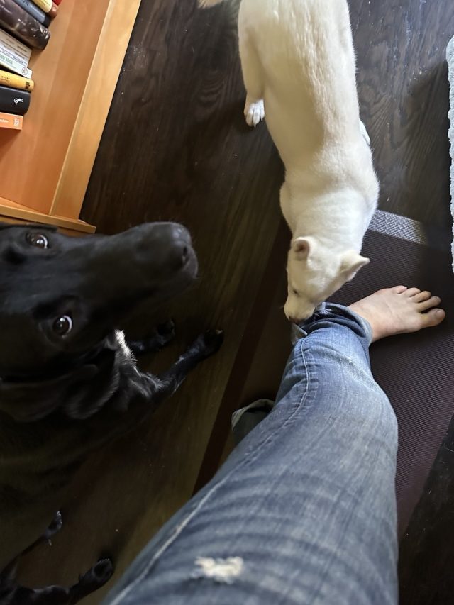 This is my typical view when I’m writing posts for your benefit. A puppy trying to tear my clothes to shreds and an older dog offering sympathy.