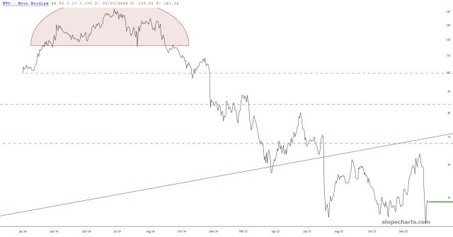 We’ve been watching the Olympics each night, and every forty-five seconds, Novo Nordisk shows the same danged commercial about the Wegovy pill. I was curious how their stock was doing, and it’s interesting how its beautiful H&S top was followed by what is so far an over 60% wipeout in value. Another victory for classic charting!
