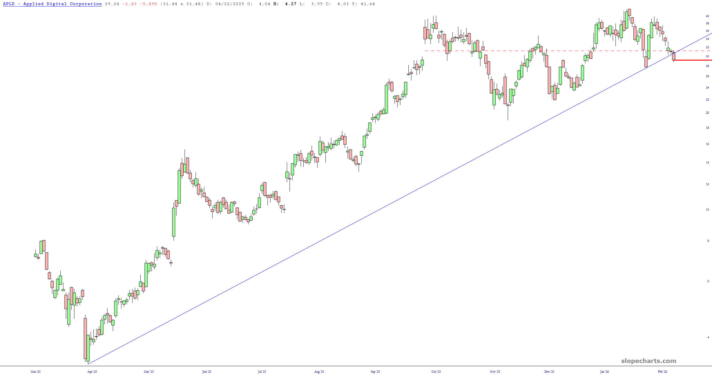 I shorted Applied Digital Corporation (APLD) a few days ago, since it is involved in the whole hyperscaling finance effort, and it’s doing well. This got even better today now that it has broken its nearly year-long uptrend. Onward and downward!