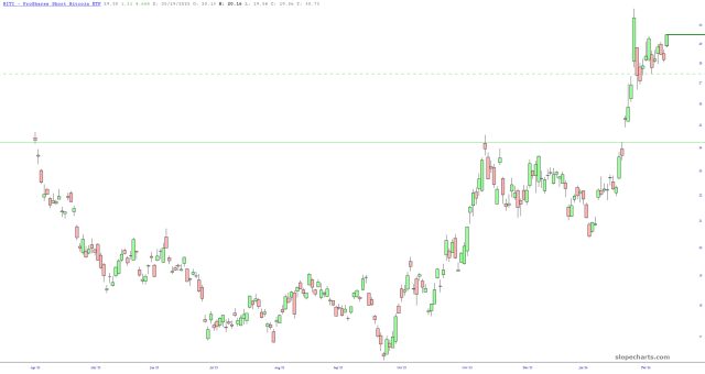 It’s an absolutely terrific day (working website, plunging market, grey skies – – what more could I ask?) Earlier today, I went long BITI in a big way (again, but this time with an attempted pledge to stick with it). This is the fund which is inverted to Bitcoin’s price path.