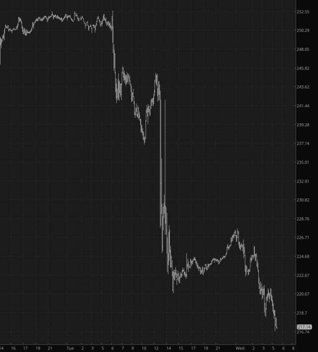 My largest short is semiconductor-related, the SMH ETF. Yesterday, SMH sold off hard but didn’t break its lower from overnight trading late Sunday. I’m certainly hoping today we snap below this level.