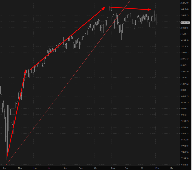 More striking is what’s going on with the /NQ, which unlike its brother above has only managed to achieve a lower high (instead of a lifetime high) and has been rangebound for months.
