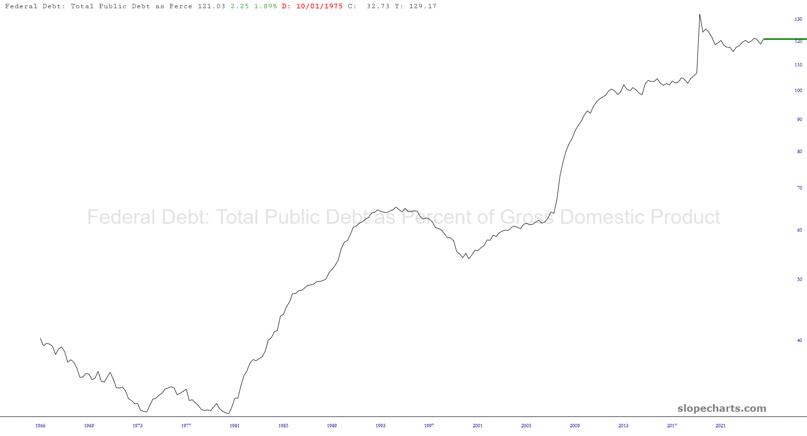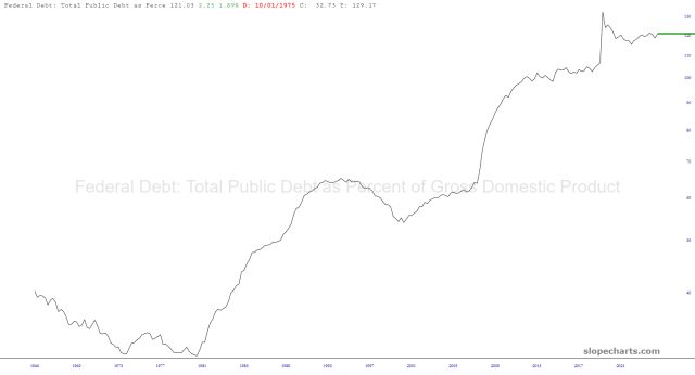 Of course, measuring nominal dollars can be misleading since they are worth less all the time. A more useful metric is the percentage of GDP which the public debt represents. We are around 125%, which is absolutely shameful.
