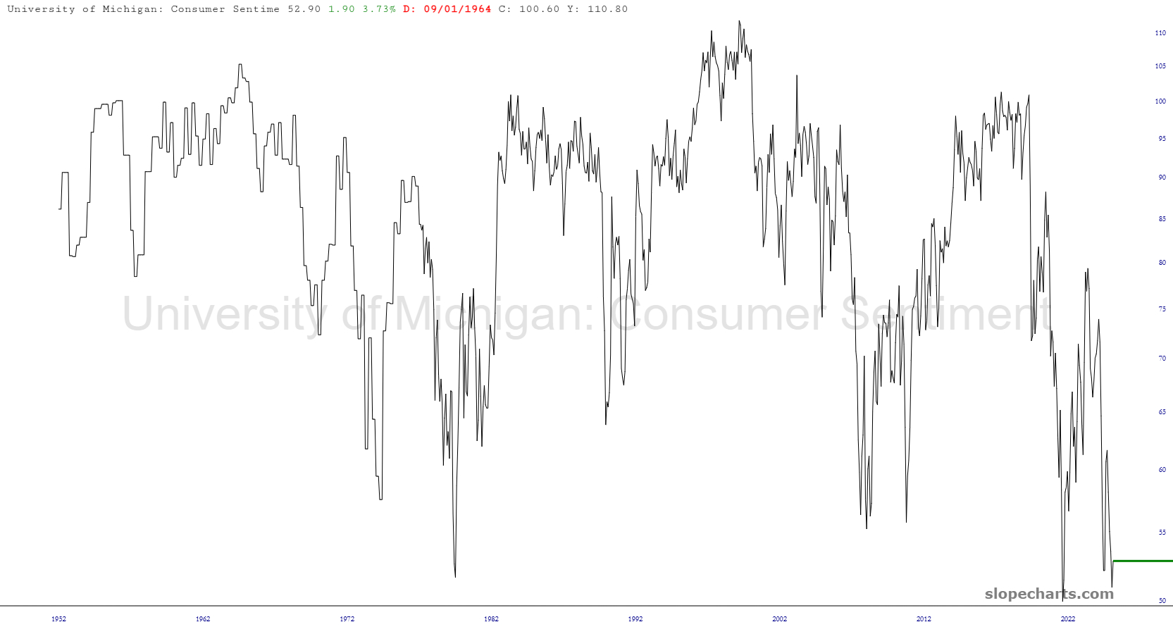 Although we’re told the U.S. is the “hottest” country on the planet, its citizens haven’t’ received the memo. Consumer sentiment is absolutely in the toilet. Perhaps, like the Gallup organization, the University of Michigan will chicken out and simply stop publishing the data, since it makes psycho-boy sad.