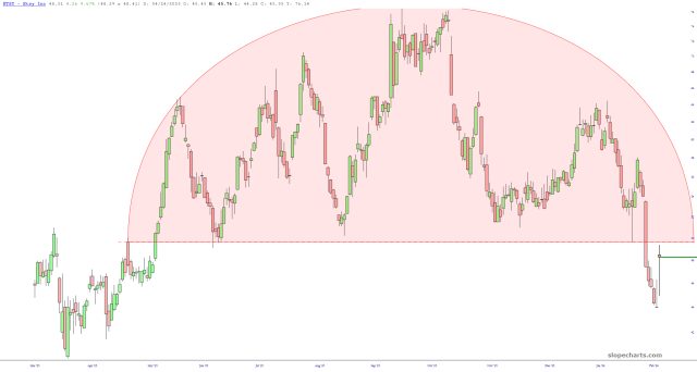 I wanted to be short ETSY since it was a beautiful H&S pattern, but it was too cheap. Well, with this morning’s rally – – problem solved!