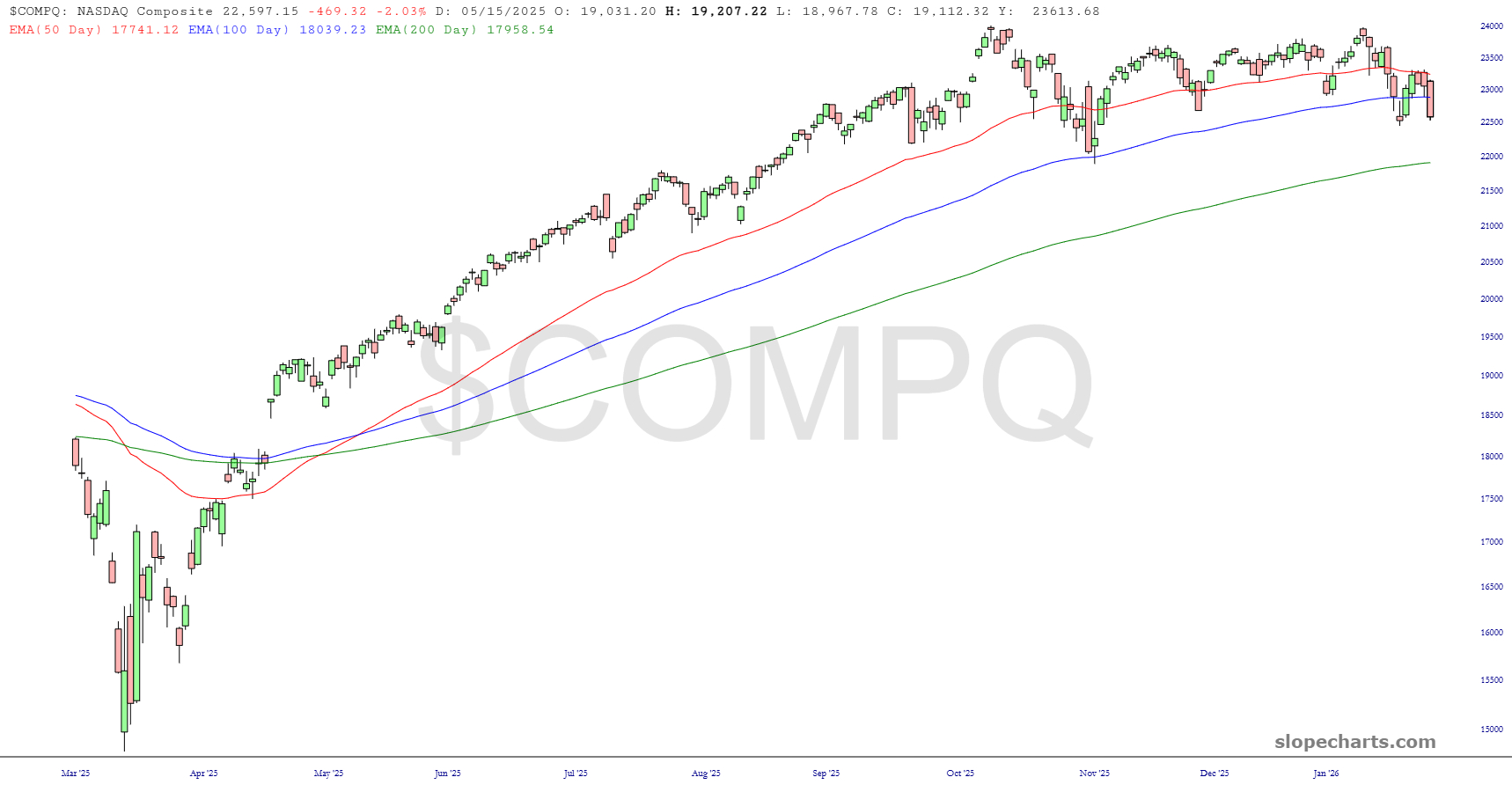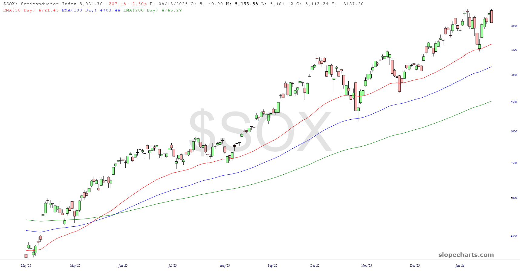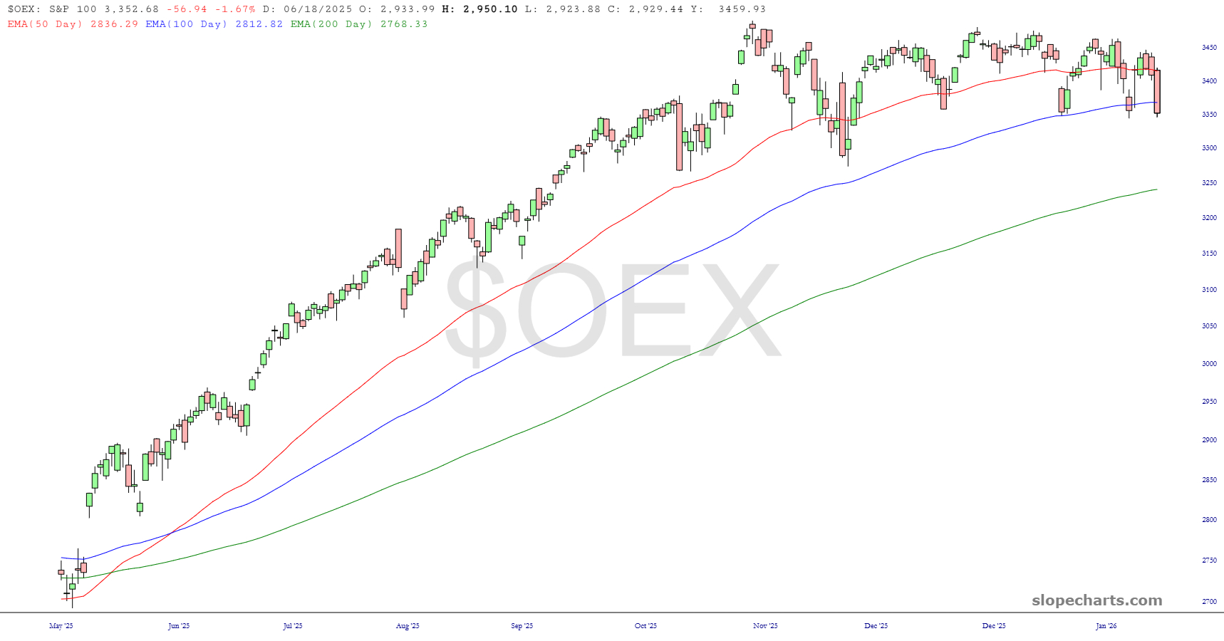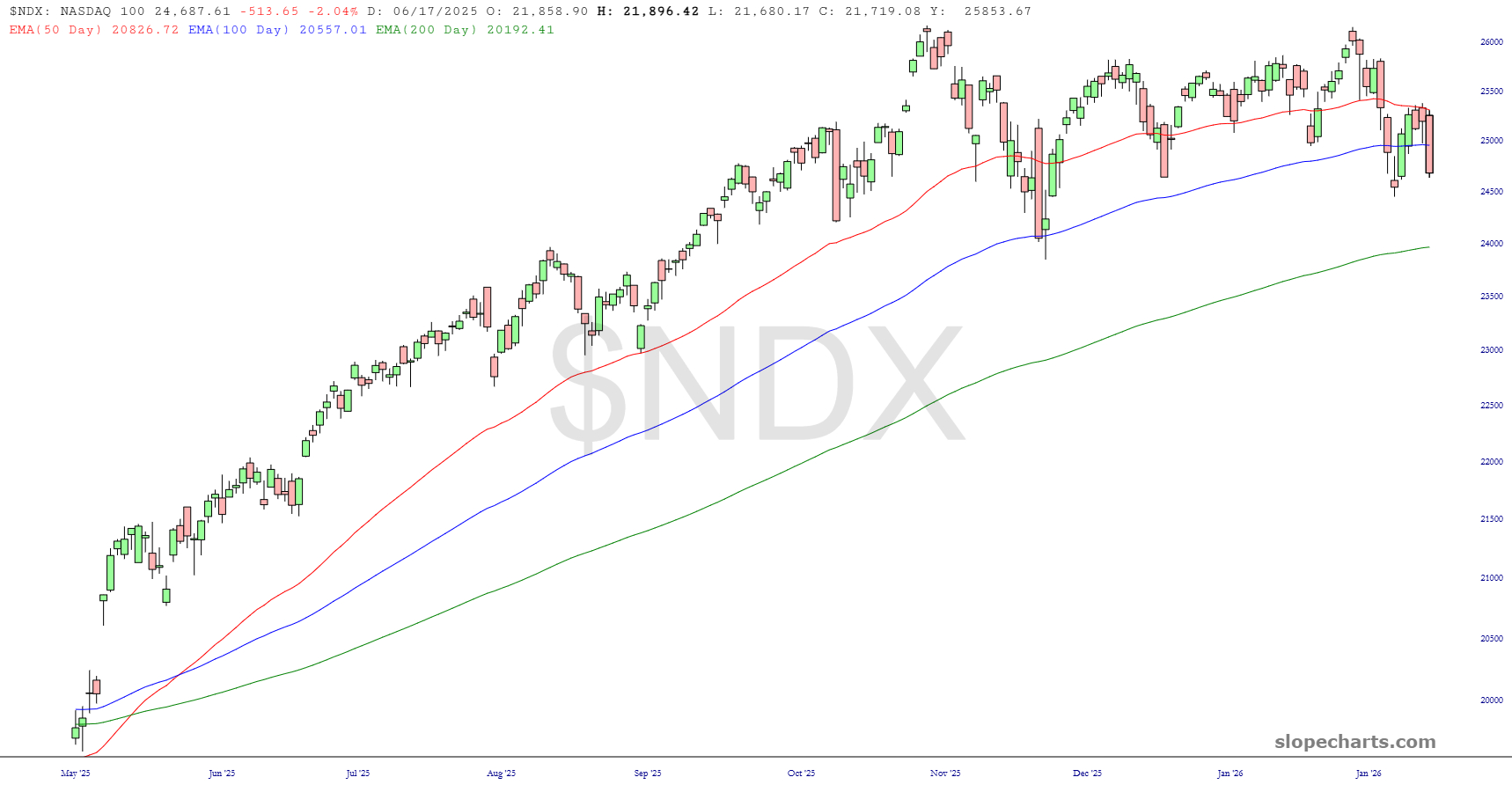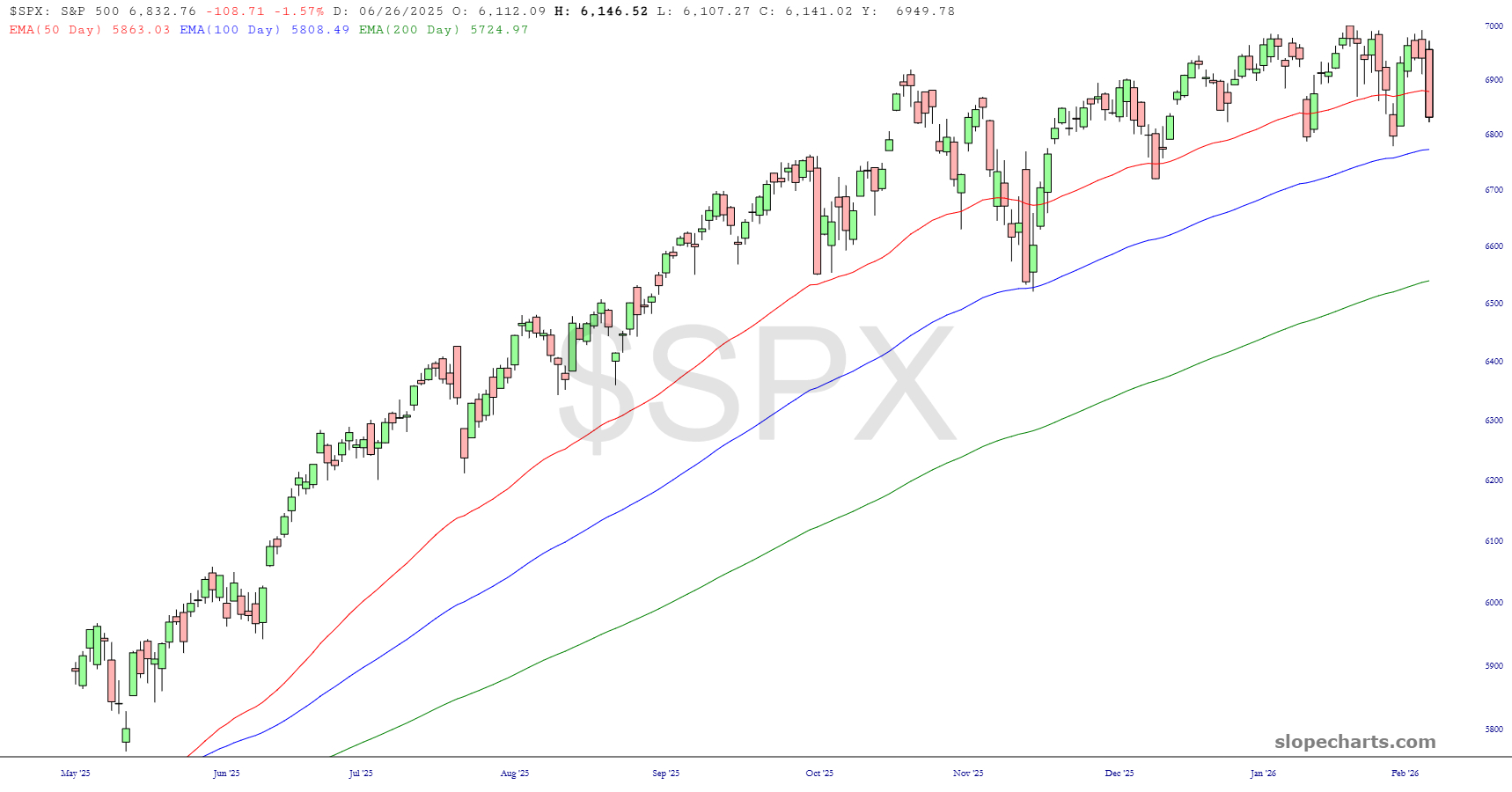 The Dow Industrials slipped hundreds of points under the psychologically important 50,000 (or, if you’re Pam Bondi, 50,000 dollar) level. Happy as I am with this drop, nothing has changed with this index. The ascent has been smooth as silk, and the trio of exponential moving averages I’m using on all these charts is just about as steady as one could hope.