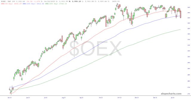 For the bears, things are looking more encouraging elsewhere. The S&P 100 has slumped to its 100-day EMA three times in the past few weeks, and if it stays weak like this, I can picture the 50-day cutting under the 100-day. As you can see, this index hasn’t made any net progress for literally months.