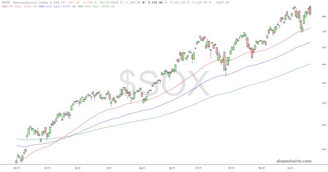Semiconductors likewise had a drop today but the EMAs are well-spaced apart and it’s going to take a lot more damage than just today to really break this index.