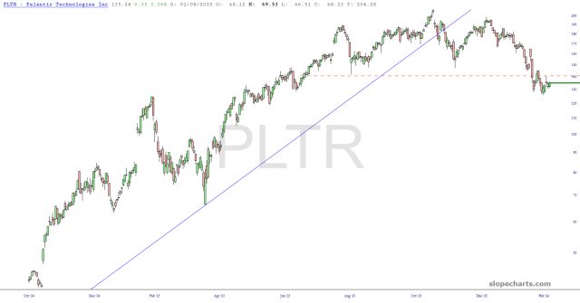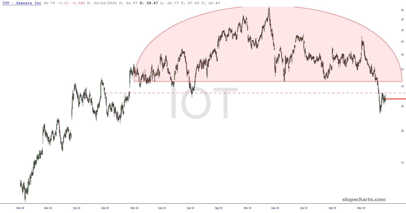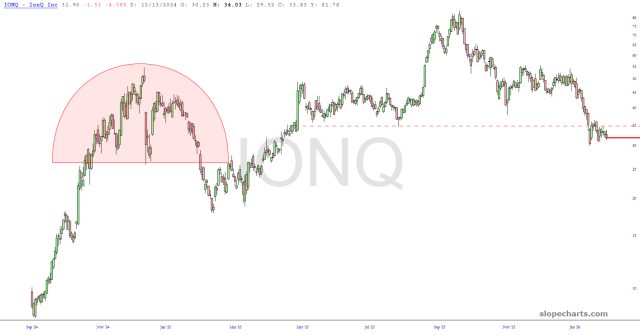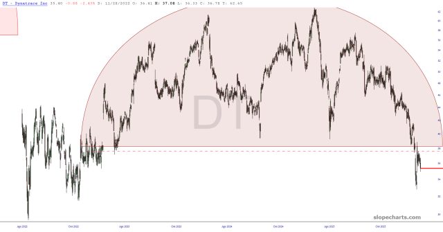 Preface to all parts: the market in general is rather uninspiring right now. There are plenty of individual stocks, however, with very interesting patterns. I have gathered up dozens of the most interesting charts and put them into groups for your perusal. This particular set includes well-formed topping patterns which are somewhat distinct from head and shoulders. There are so many of these that I have broken them into two posts.