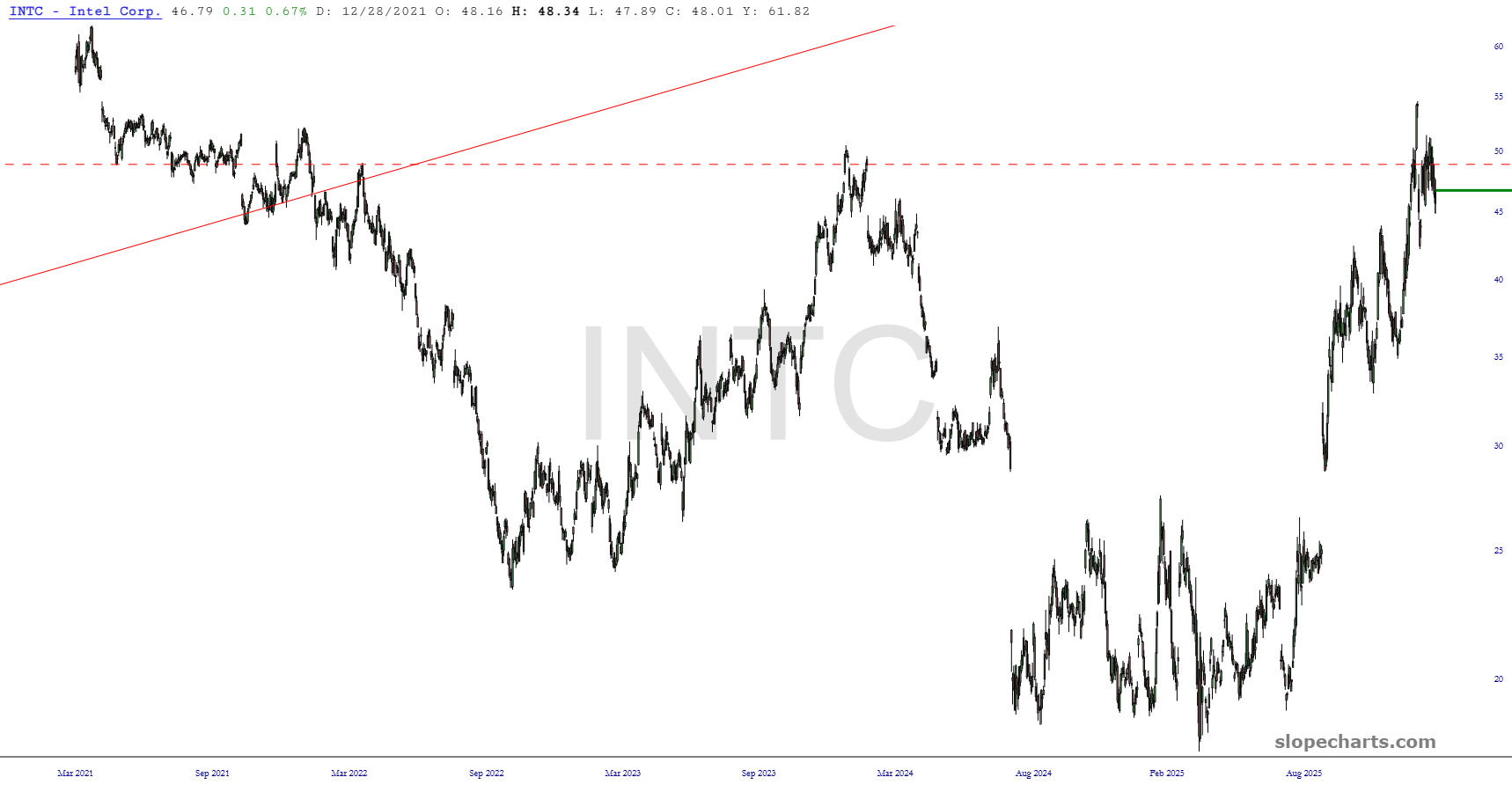 Intel is a very profitable short thus far, but it needs to respect resistance and retrace its massive up-move (funded by the generous federal government’s bailouts).