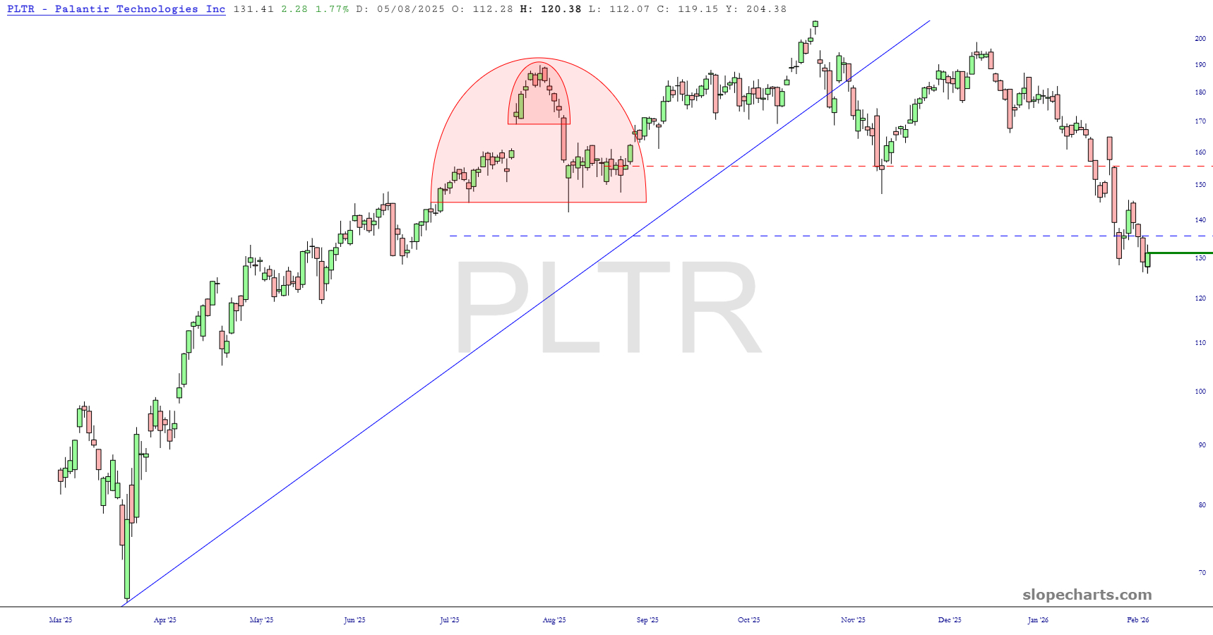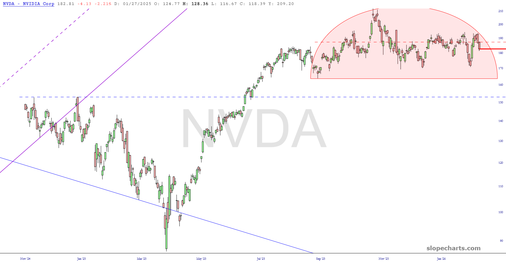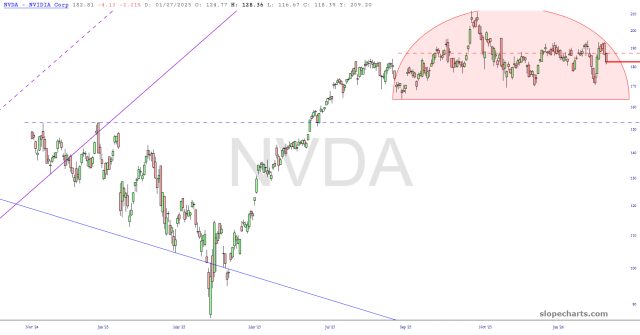 OK, good, a real pattern again: Nvidia has been grinding it out for nine months now, and as robust as it is – – and hear me well – – a true completion of this top would send the entire tech sector down the same garbage chute that software stocks just descended.