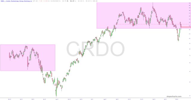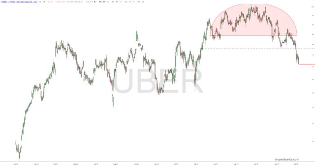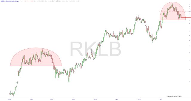 I have put options on all the charts below – all of them with a June expiration, except for RKLB, which is way out into next January. The biggest winner right now, by far, is UBER, with almost a 70% profit. As the expiration date suggests, I have bigger hopes for these trades. I have zoomed in on the most relevant portions of recent price history.