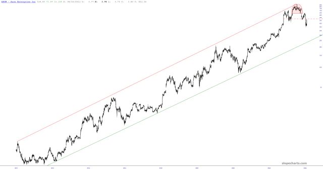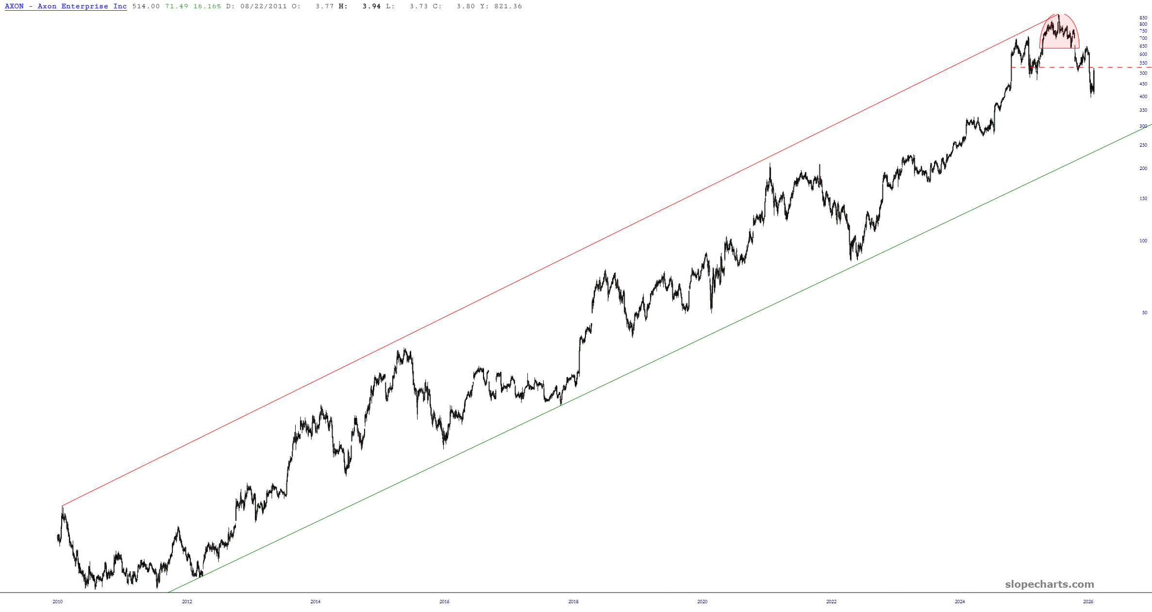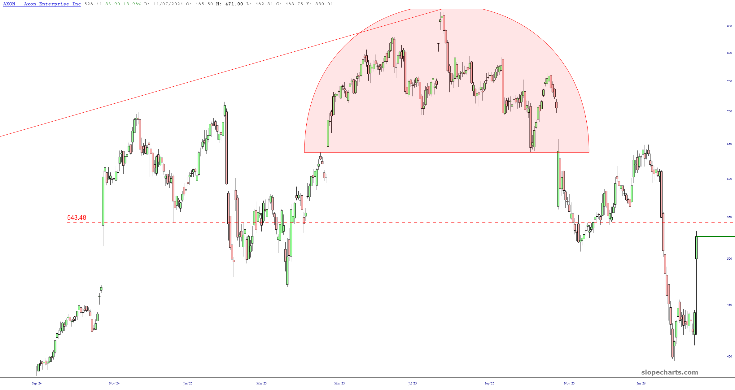 I covered my AXON short a few minutes after the close yesterday in the face of their explosively-positive earnings report. That left a scar, but I got out way cheaper than if I had just stayed put. Today I seek my vengeance. It isn’t a big position, but I have re-shorted AXON with a stop at 557. My entry price was 525.
