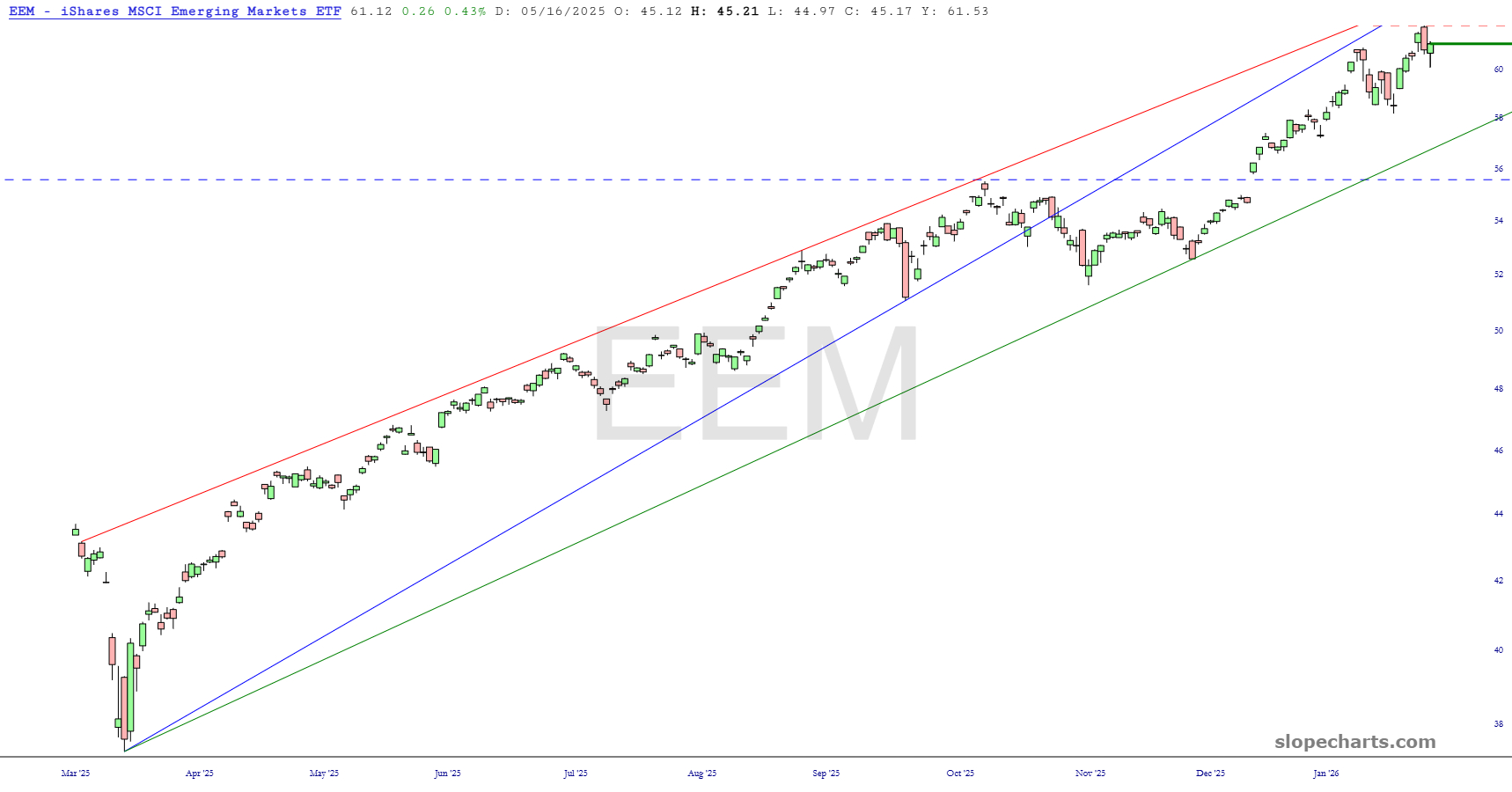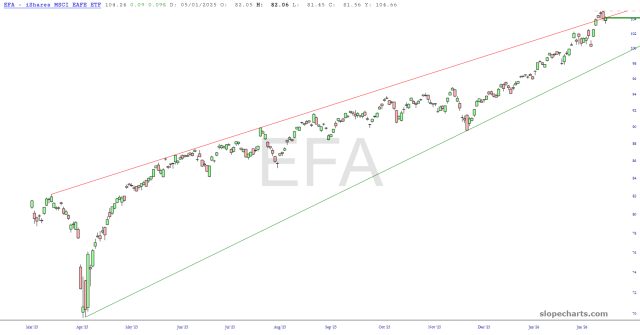 Similarly situated is the EFA, equities outside of North America. This uptrend has been so powerful that it exceeded its ascending wedge, although is slipping below it again.