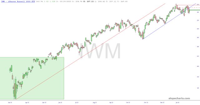 The small caps have become intriguing. The island reversal pattern has stayed intact, and we cracked the medium-term trendline. This is my largest short right now.