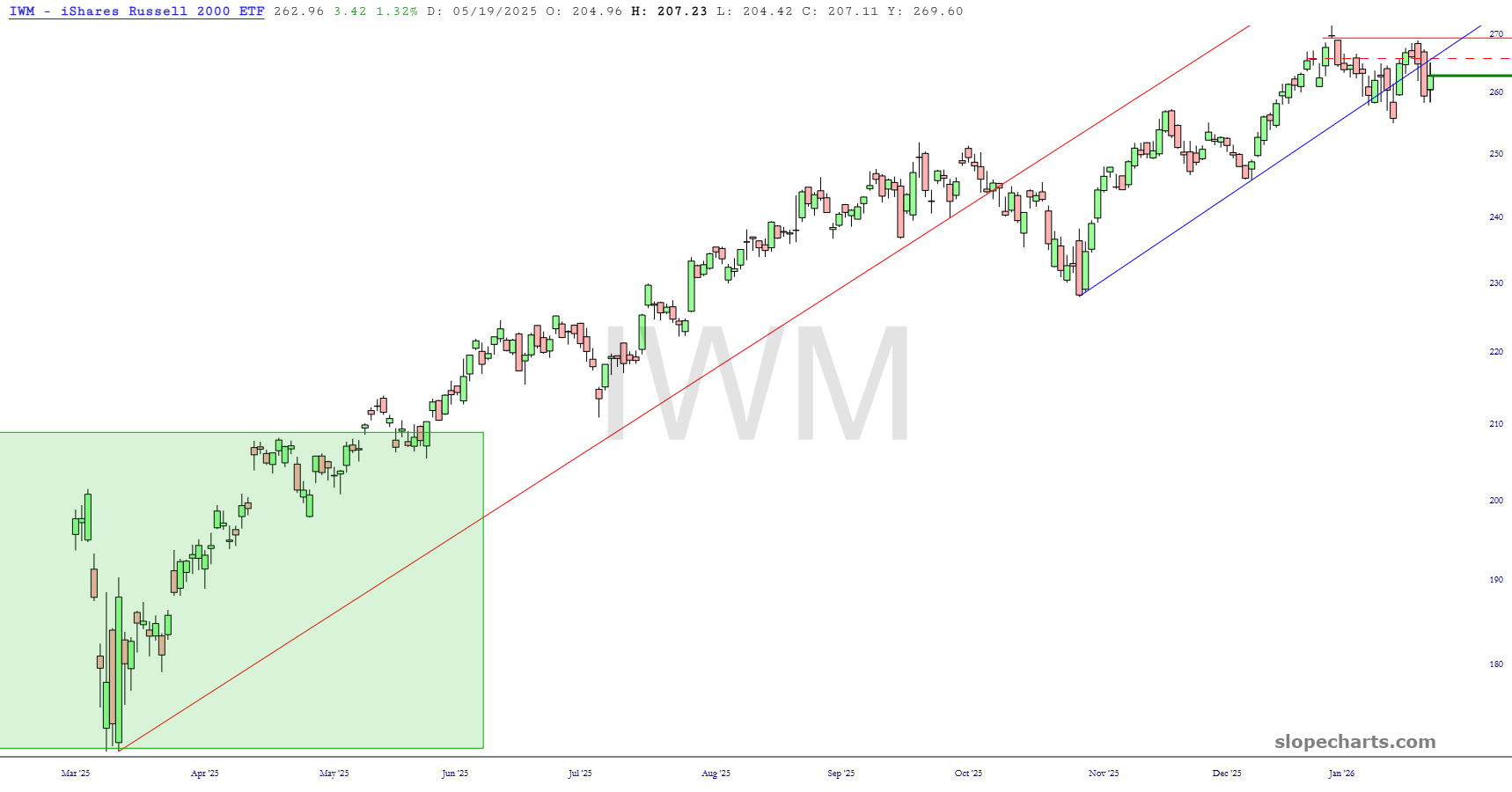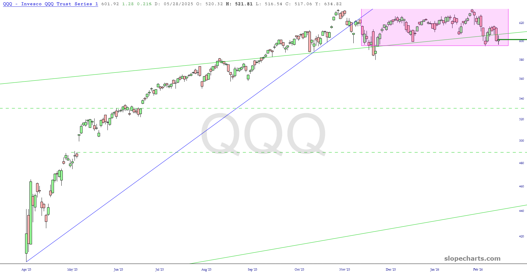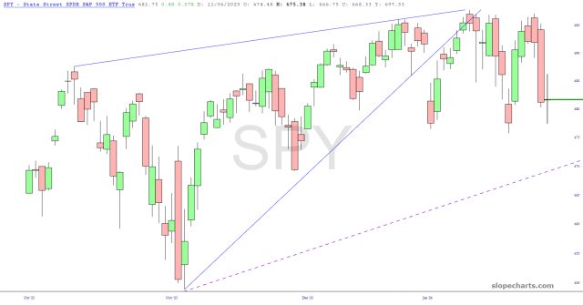 First up is the DIA, based on the Dow Industrials which Kim Bondi single-handedly blew up with her hubris and shrieking. We are sub-50,000 again and have failed the breakout represented by the horizontal. What we really want to see is a failure of that medium-term trendline, anchored to last November’s low.