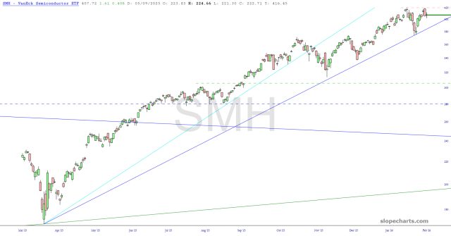 Semiconductors are also respecting their uptrend, but here, too, the horizontal is key. If we can maintain below that lifetime high and, again, Ursine God smile upon us, cut below that trendline, it’s party time.