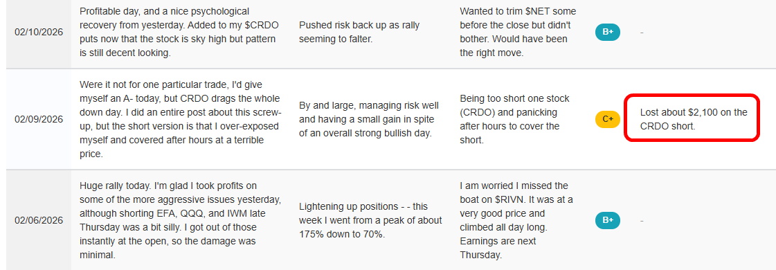 My self-assessment “grades” have been strong all year with one exception, which was back on February 9th when I gave myself a C+. The reason was that I muffed my Credo (CRDO) trade, and I was pretty pissed at myself.