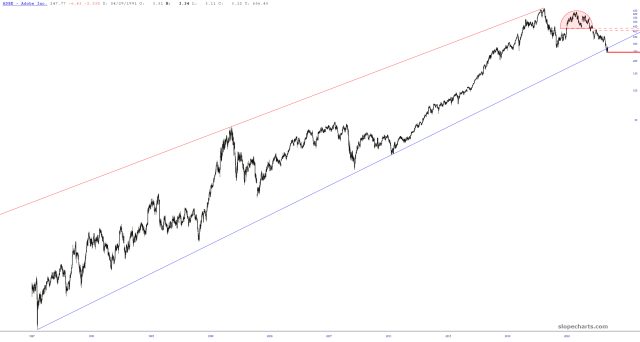 Human beings around the world are REJOICING that Adobe, a company mostly known for overpriced subscriptions which are virtually impossible to cancel, is getting destroyed. It is down 65% from 2021 during one of the most stupid bull markets in history, so its true value is probably 95% lower than its peak. Its lifetime trendline is broken, and even though I have no position, I am delighted to see this pig get laid waste.