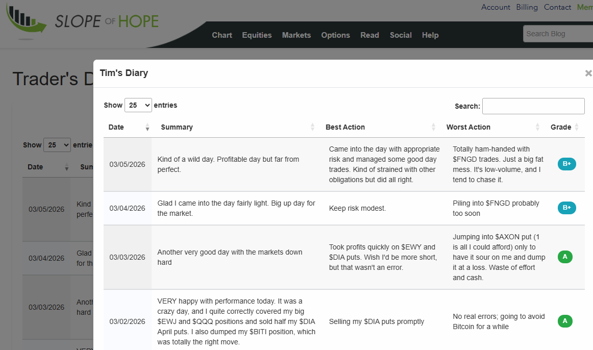 As one of the last honest human beings on the entire planet, I’ve added a feature on the site which makes me even more transparent: on the Trader’s Diary page here on my beloved Slope, you can click a button now which will let you read my unedited diary.