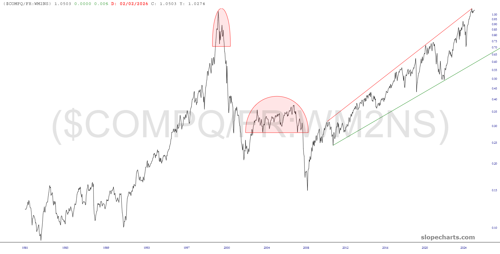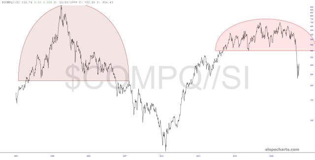 The NASDAQ is still insanely overvalued compared to the money supply, although I’m sure the forthcoming monster bear market will take care of this historical extreme quite handily.