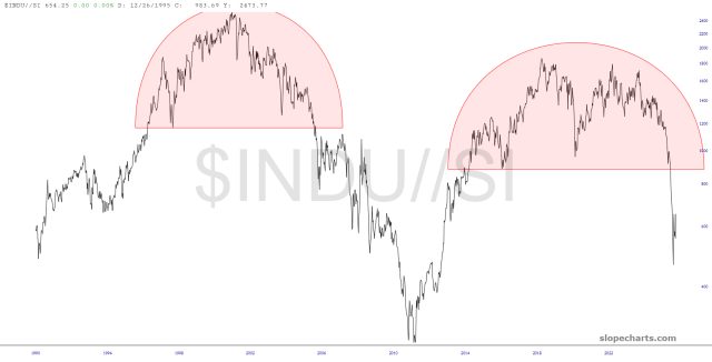 The last three charts all show roughly the same theme: bearish stocks/bullish precious metals. The problem with these, if you want to call it that, is that present price levels are kind of in a no man’s land in which it’s impossible to know whether the price is heading lower or higher in the near-term. All that is clear to me is that, long-term, the price levels have much more downside.