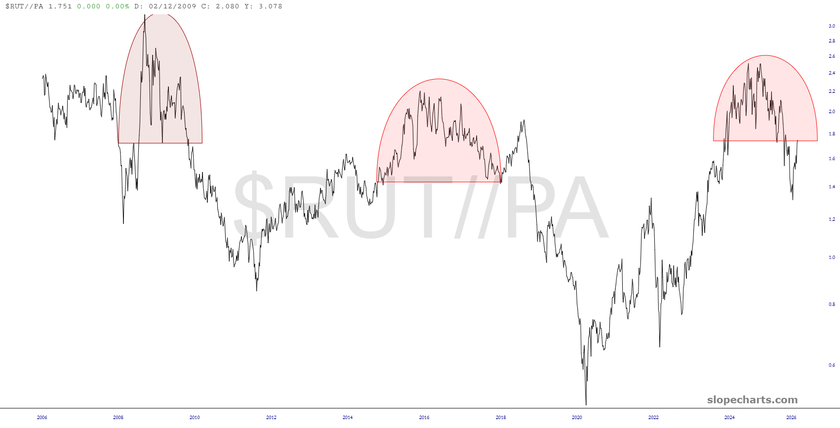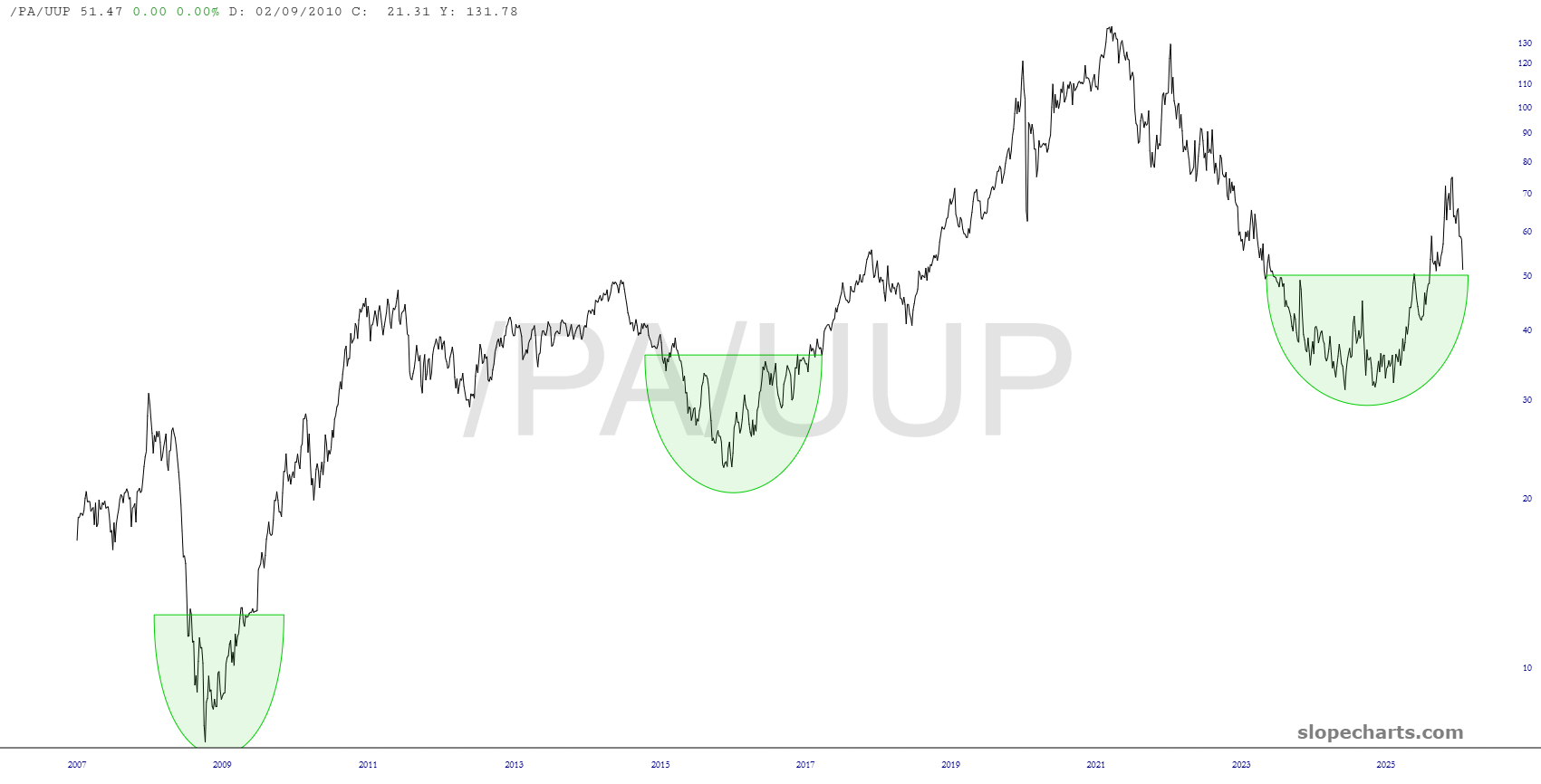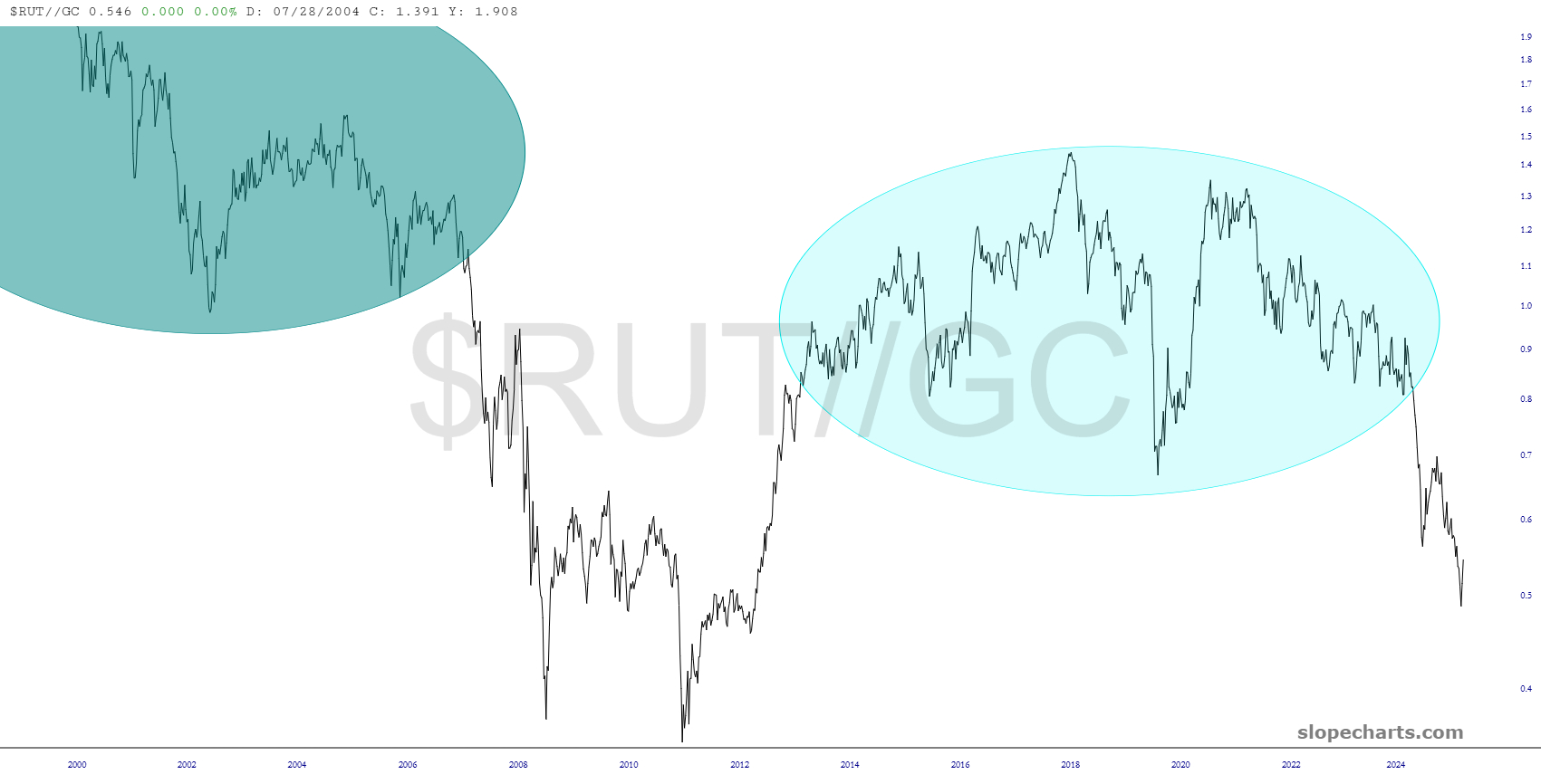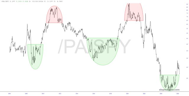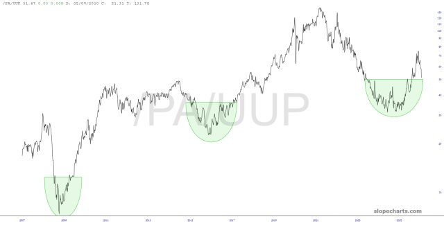 Months ago, I was nearly obsessed with palladium, but it has fallen off my radar until just very recently. It seems that we may be near an interesting point based on this chart of the Russell 2000 versus palladium, which appears ready to take a hard fall.