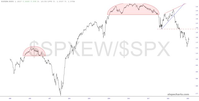 The equal-weighted S&P has been generally degrading versus the ‘normal’ SPX for years. A handful of stocks continue to be largely responsible for holding up this quickly-rotting market.
