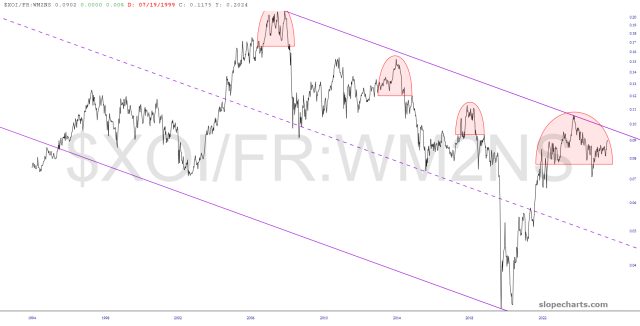 In spite of oil’s strength, and the jaw-dropping rise of energy companies lately, the long-term prospects for the oil index versus the money supply remains bearish. I will note that this data is about a month old, so it is possible that the updated ratio will show a breakout above this very long-term channel, which would negate that point.