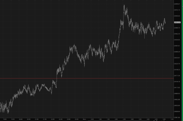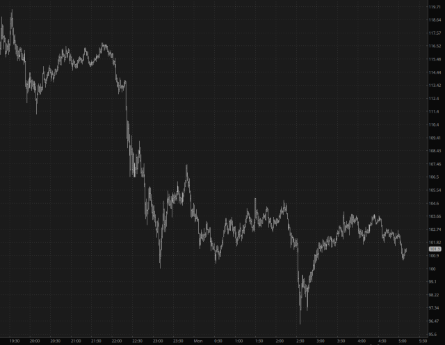 As is so often the case with thrilling Sunday night action, by the time we wake up to see what Monday holds, the movement is wholly or partly gone. For example, crude oil last night was on an absolute tear, moving up to about $120: