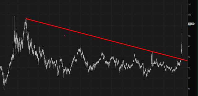 I am not trading anything related to energy at all (with the mild exception of a short position in HAL, which is virtually unchanged at the moment), but the move in oil is tremendous. The breakout from the 60s to about DOUBLE that amount is extraordinary, although I’m staying miles away from this thing, since the width of possible price is wider than the Strait of Hormuz.