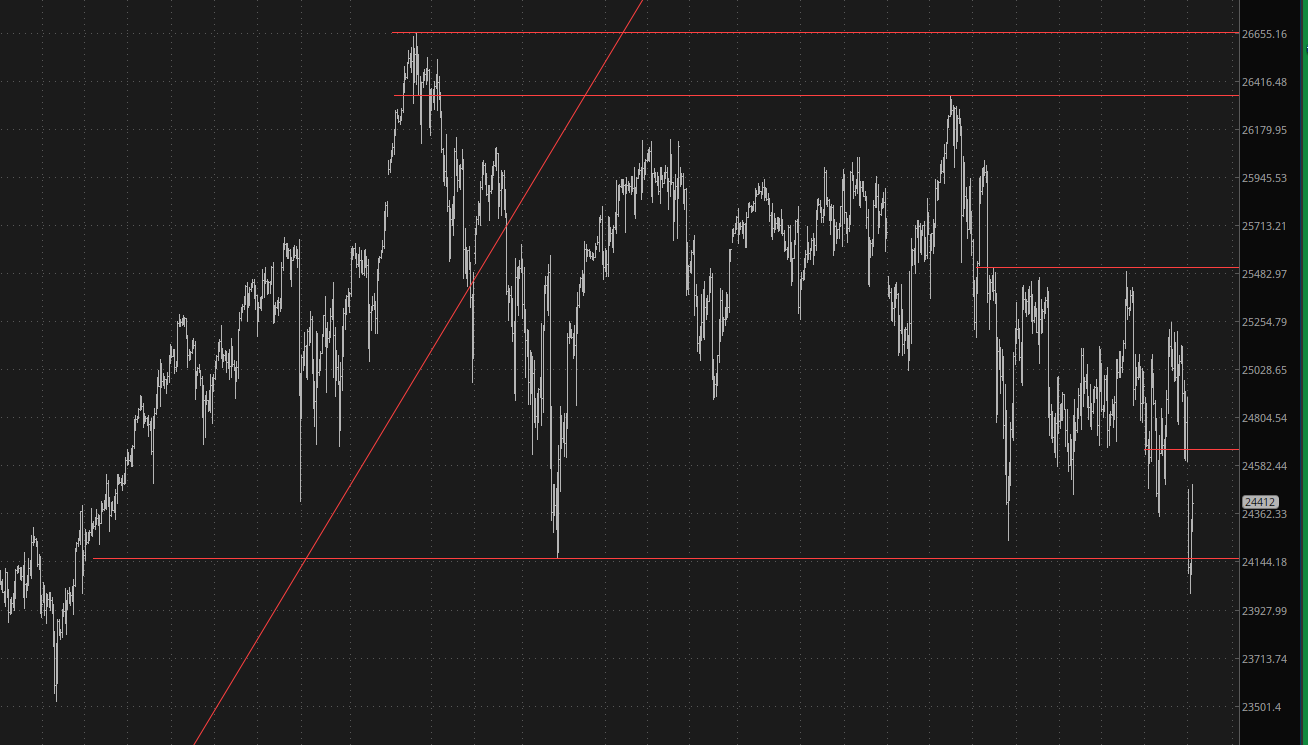 An even longer-term chart makes this plainer. This is a gargantuan top. We cut below support briefly last night, and we’re recovering to the gap, but the damage is done. It’s quite obvious what tremendous potential a fall from a gap this well-formed has.
